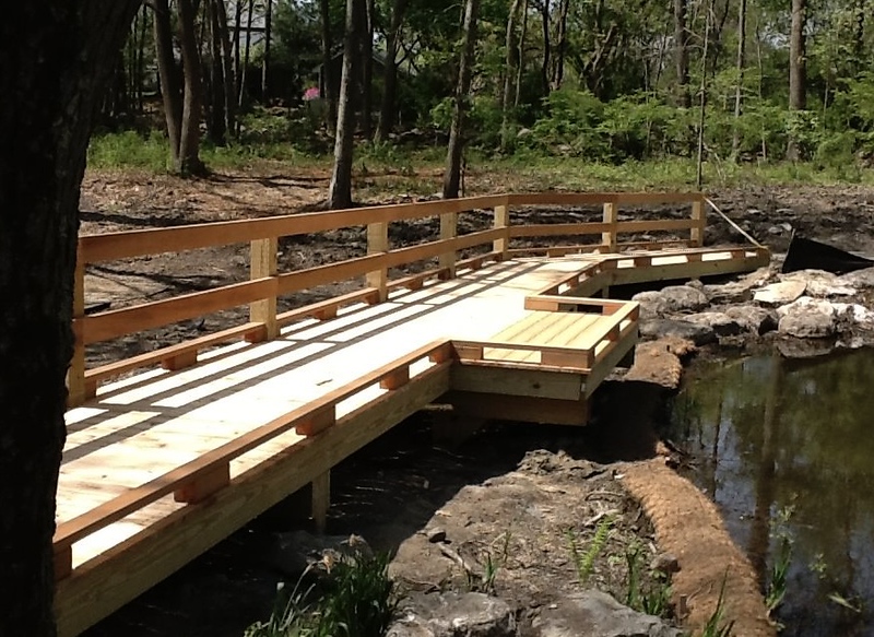 This boardwalk was built to connect our customer to the other side of his property and navigate around the pond. The support system of the boardwalk is built out of pressure treated wood to increase longevity and the walkway and rails are built from clear (unknotted) red cedar. A decorative kick rail was also added for a finished look and a protective foot barrier.